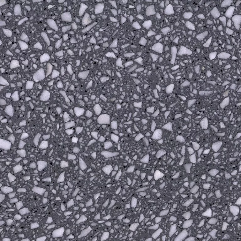 Athenian Grey is a striking terrazzo with a deep dark grey base that exudes sophistication and depth. Scattered throughout the surface are small white and black flecks, creating a dynamic contrast that adds interest and texture.