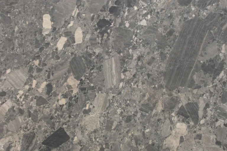 Ceppo Grey limestone is a visually arresting natural stone, instantly recognizable by its coarse-grained brecciated structure. Composed of angular fragments embedded in a fine-grain base, the slab displays a bold mosaic of cool greys, off-whites, and warm taupes — a geological signature that brings both texture and rhythm to any surface.
