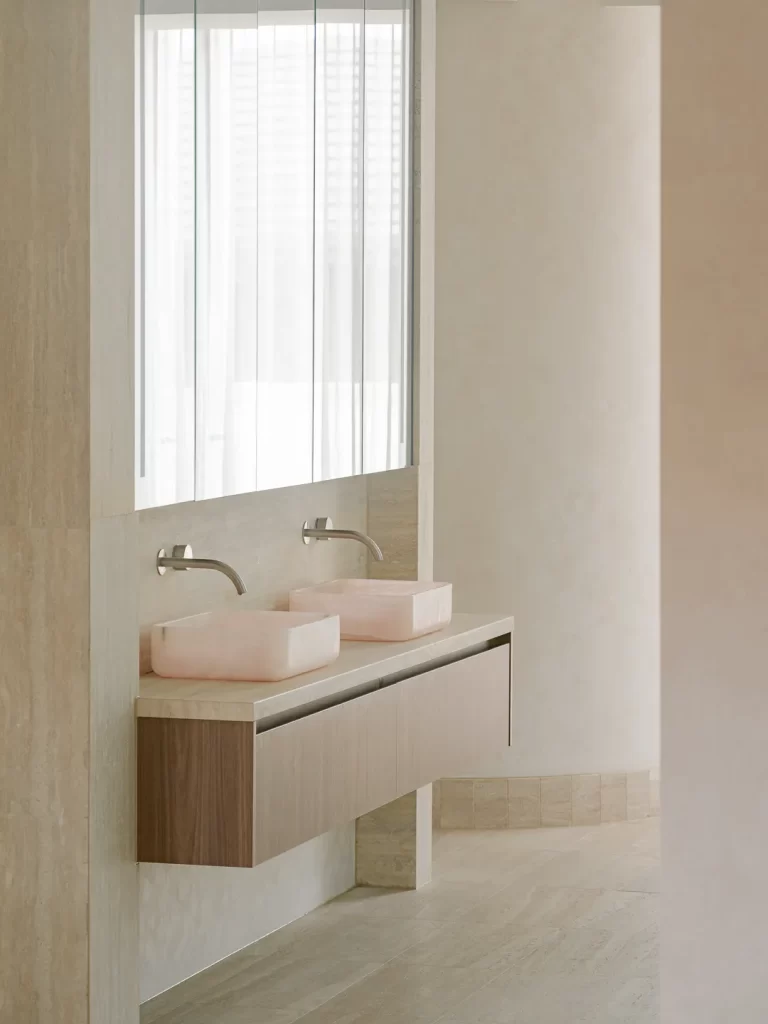 The Kooyong Residence in Melbourne is a masterful blend of heritage restoration and contemporary design. This project involved the meticulous renovation of a grand Victorian dwelling, preserving its historic charm while introducing a modern double-storey addition at the rear. The design concept centers around two distinct pavilions, the original front section and the new extension, connected by a glazed bridge that traverses the central courtyard, creating a dynamic interplay between old and new. The use of Milano Raw Vein Cut Travertine throughout the interiors and exteriors adds a timeless elegance, enhancing the home’s aesthetic appeal and providing a seamless transition between spaces. This thoughtful integration of materials and design elements reflects a commitment to craftsmanship and a deep respect for architectural heritage.